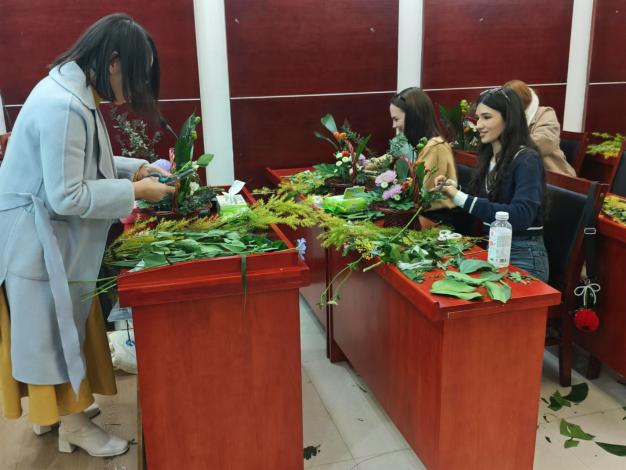 活动过程中,同学们一步一步地跟着廖金花老师学习插花,整个氛围温馨和谐,笑语不断。在廖老师的指导下,同学们都完成了自己的插画作品。来自泰国的孙岚同学高兴地说:“我完成了一件非常漂亮的插花作品,学到了很多插花技巧,这个活动真的太棒了!”